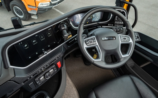 O novo TATRA PHOENIX oferece um interior completamente renovado com vistas inigualáveis e um painel de instrumentos luxuoso. A combinação de botões de controlo e ecrãs táteis otimiza a conveniência e a ergonomia, permitindo que o condutor se concentre exclusivamente na condução com o máximo conforto.
